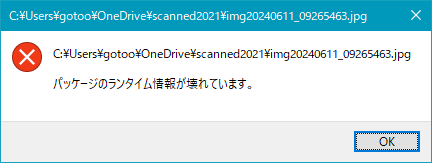 仕事場のPC(Win10)で、スキャン画像を開こうとしたら突然「パッケージのランタイム情報が壊れています」というエラーが出た。